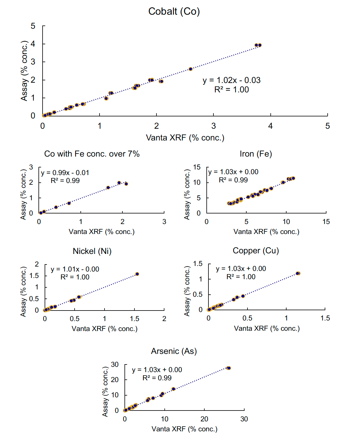 Vanta X射線熒光分析儀得出的數(shù)據(jù)與實驗室數(shù)據(jù)在鈷(Co)含量方面顯示出卓越的相關(guān)性,即使在濃度低于0.05%且鐵(Fe)含量超過10%的情況下也是如此。砷(As)、鎳(Ni)和銅(Cu)的數(shù)據(jù)也與實驗室數(shù)值相比展現(xiàn)了極高的準確性。