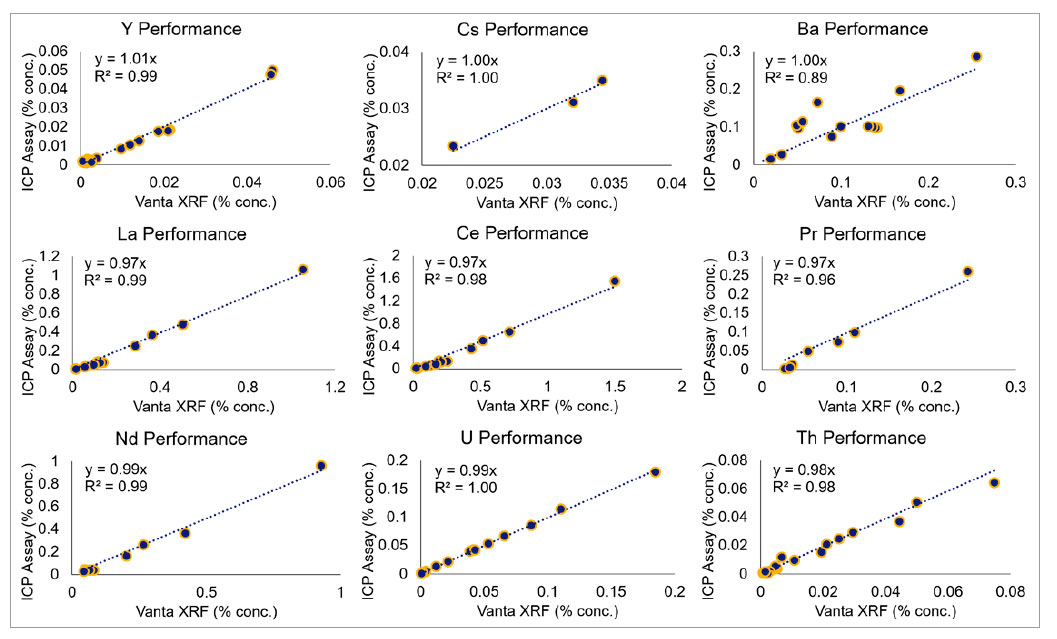 Vanta手持式XRF光譜儀在檢測各種礦石樣品(包括氟碳酸鹽和次生磷酸鹽)時,表現出非常高的性能。氟碳酸鹽通常是氟碳鈰礦石,可提供釔、鈰和鑭;而磷酸鹽通常是獨居石,不僅含有鑭、鈰、鐠和釹,還含有較重的稀土元素釤和釓,以及放射性較弱的釷。正如每個圖表所示,元素的斜率和R2都接近于1,說明Vanta在檢測氟碳鈰礦石和獨居石時均表現出很高的準確性。