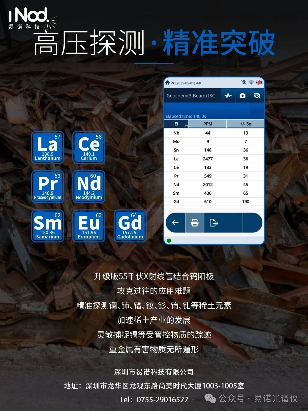 雖然稀土元素在技術上并不“稀有”,但它們通常不會像金(Au)或其他礦物那樣以高含量的礦脈形式存在。因此對稀土礦石的識別和開采非常困難。此外,稀土礦石的加工是一項較為獨特、主要是化學工程的任務,遠比加工金和賤金屬礦石復雜。Vanta手持式XRF光譜儀可以檢測低至兩位數ppm水平的稀土金屬,是在現場快速識別這些寶貴元素的理想工具。此外,Vanta光譜儀可以在野外計算稀土氧化物的含量,如下圖所示。圖2.