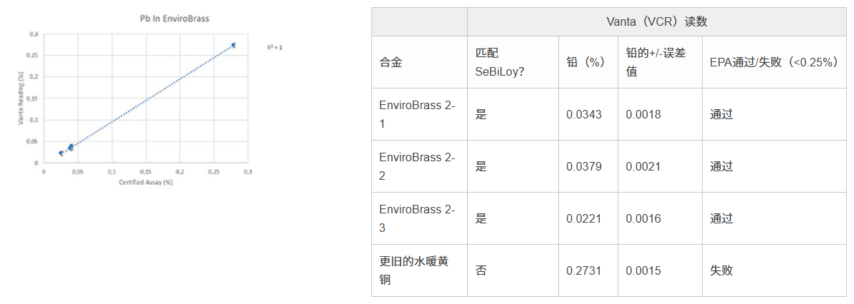 我們可以使用Vanta VCR型號分析儀,分析多種黃銅和銅合金認證參考材料(CRM),以辨別出不同的重金屬和受到監管的元素。Vanta XRF分析儀具有探測各種不同環境黃銅中低水平鉛元素的優質性能,可以確保所用水暖材料符合0.25%鉛含量的要求,如下圖所示。在所完成的鉛元素定量分析的過程中,10多次檢測的結果表明:鉛的含量都低于監管的操作水平。此外,我們還分析了一個更舊的不符合規范的黃銅樣件,以進行對比分析。