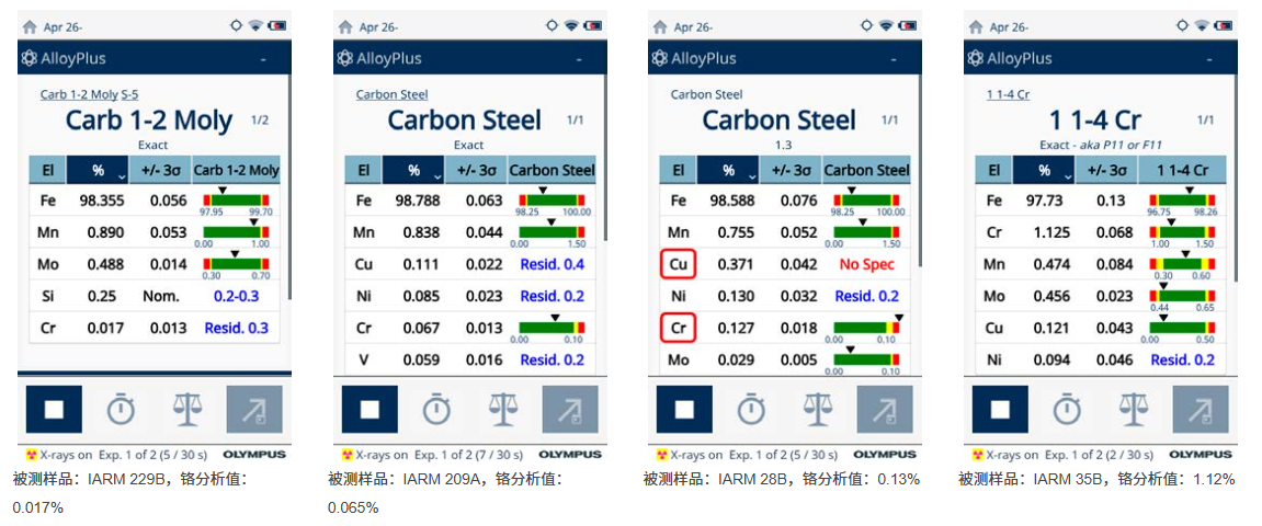 下面幾張圖是Vanta分析儀在對碳鋼中的鉻進行分析的過程中,顯示在分析儀屏幕上的結果。在這些圖像中我們可以看到,7秒鐘之內,屏幕上就顯示了預測流動加速腐蝕所需的鉻含量讀數。