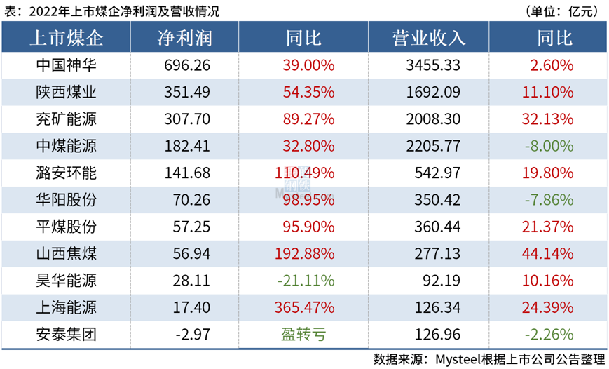 在此之前,陜西煤業(yè)2022年實(shí)現(xiàn)營(yíng)業(yè)收入1692.09億元,凈利潤(rùn)351.49億元;我國(guó)煤炭龍頭中國(guó)神華2022年?duì)I收達(dá)到3445.33億元,實(shí)現(xiàn)凈利潤(rùn)696.26億元,日賺近2億元。