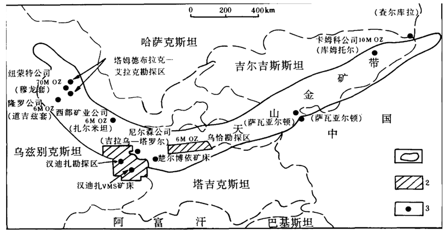 天山西段,從烏茲別克斯坦向東,經(jīng)塔吉克斯坦、吉爾吉斯斯坦到中國(guó)新疆,構(gòu)成了世人矚目的巨型金成礦帶,即“亞洲金腰帶”。烏茲別克斯坦、吉爾吉斯斯坦等幾個(gè)國(guó)家在這條成礦帶上發(fā)現(xiàn)了眾多大型、超大型金礦。其中,最為著名的當(dāng)屬于烏茲別克斯坦的穆龍?zhí)捉鸬V床,該礦是世界級(jí)超大型獨(dú)立金礦床,遠(yuǎn)景資源儲(chǔ)量預(yù)估1.7億盎司(5287.6噸),平均品位約3.5克/噸。該礦2022年生產(chǎn)了約1700盎司(約48.2噸)的黃金,是全球第二大在產(chǎn)金礦。