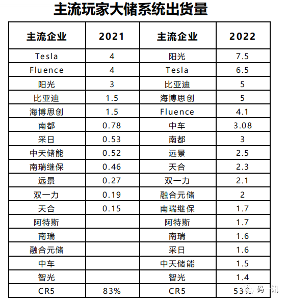 2022年Tesla、陽光、比亞迪、海博思創、Fluence市場份額占據全球前五,高達56%,整體市場分散,頭部企業尚未形成