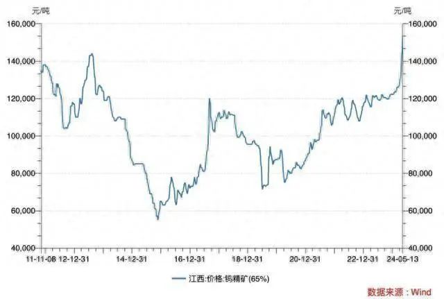 小金屬方面,年初至今,鉬精礦(45%-50%)上漲17.4%,錫上漲24.9%。被譽為“工業牙齒”的能源金屬鎢的價格在近期沖上了十年新高。江西地區65%品位的鎢精礦在5月13日的均價達到了15.35萬元/噸,較年初已上漲25%,創下了自2013年以來的新高。
