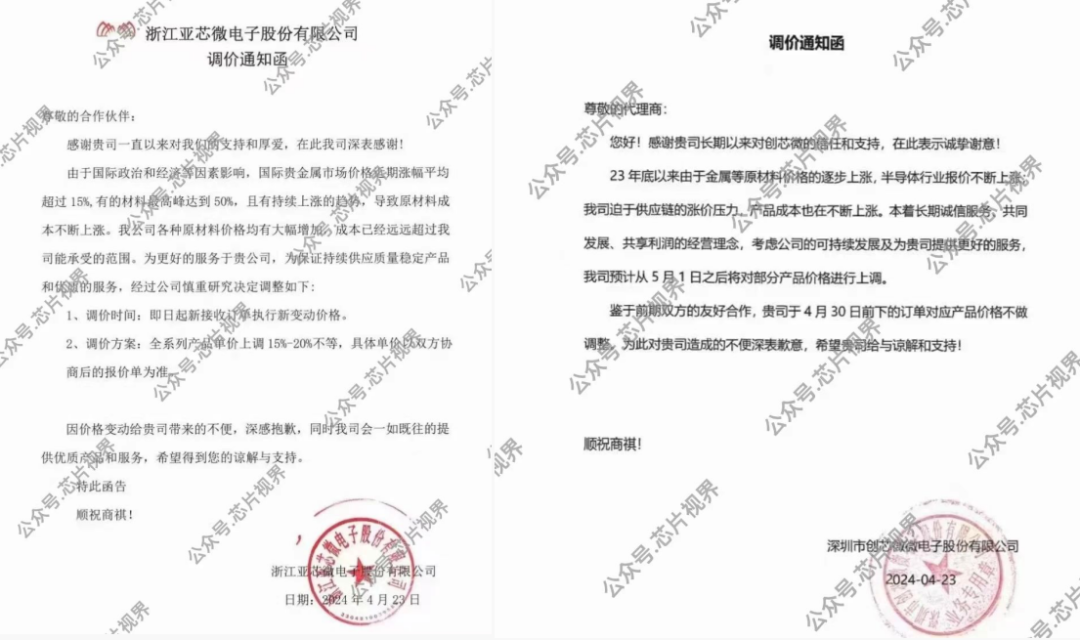 國際貴金屬市場價格持續上漲,使得芯片制造的原材料成本不斷攀升,芯片廠商面臨巨大的成本壓力,近期紛紛宣布漲價。浙江亞芯微電子表示,全系列產品單價上調15%-20%不等;深圳市創芯微電子表示,5月1日起調漲部分產品價格;南京市智凌芯表示,全線系列產品調漲;無錫華眾微電子表示,部分產品價格上調,幅度為10-20%。