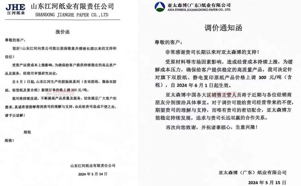 隨著文化用紙行業巨頭們的一紙公告,市場迎來了6月1日的統一價格上調,每噸產品提價300元。山東江河紙業新接訂單價格上調300元/噸,山東華泰紙業所有文化紙系列產品價格上調300元/噸,山東晨鳴紙業文化紙產品價格上調300元/噸,亞太森博(廣東)紙業針對旗下雙膠紙、靜電復印原紙產品價格上調300元/噸(含稅)。