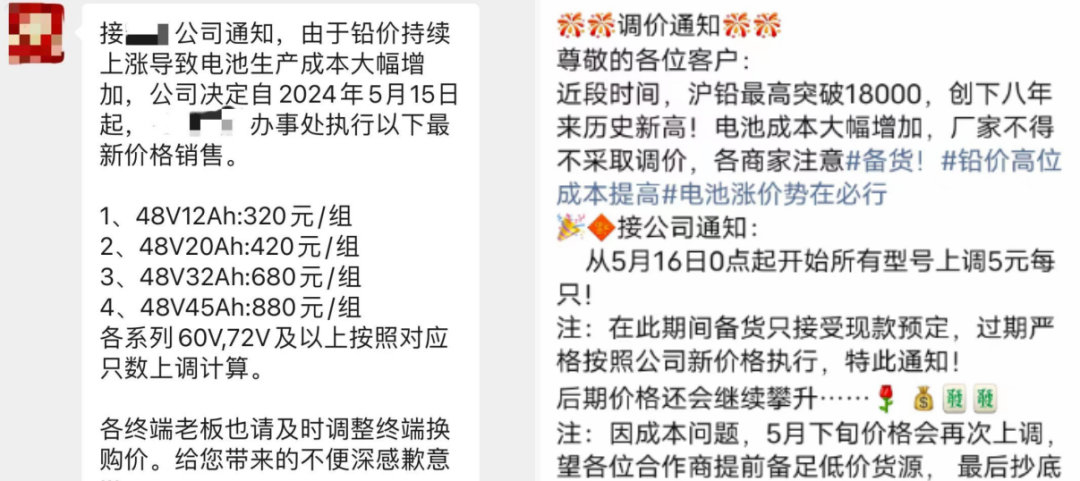 某電池品牌表示,從2024年5月15日起,48/12按照320元/組、48/20按照420元/組、48/32按照680元/組、48/45按照880元/組的價格執行,各系列60V、72V及以上按照對應只數上調計算;另有企業表示,5月16日開始,所有型號電池上調5元/只,另外由于成本因素,5月下旬價格會再次上調,建議電動車行業商家合理安排庫存。