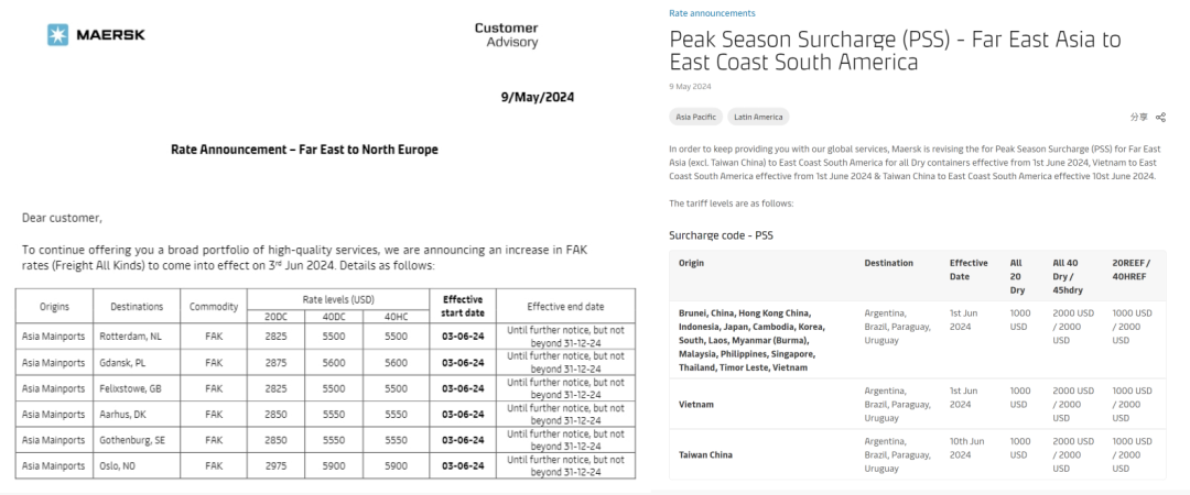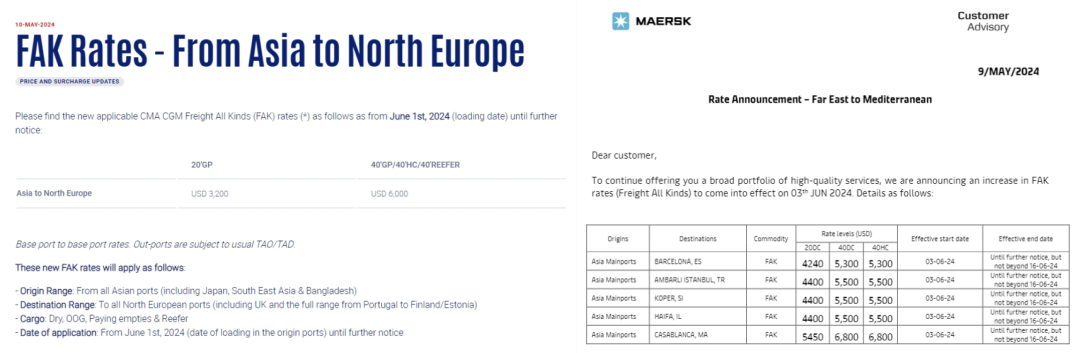船公司們宣布新一輪運價調整計劃,馬士基和達飛兩大航運巨頭已宣布6月再提價計劃,上調北歐FAK費率。其中,馬士基每40尺柜最高5900美元,達飛再次上調1000美元,每40尺柜6000美元。赫伯羅特、HMM等船公司繼續調整部分航線的費率,涉及歐地、非洲、南美、北美等。5月上旬美線(運價)已經連漲了兩次,每次各漲了1000美元左右,漲價還將繼續,并將在5月下旬飆升到5000美元以上。