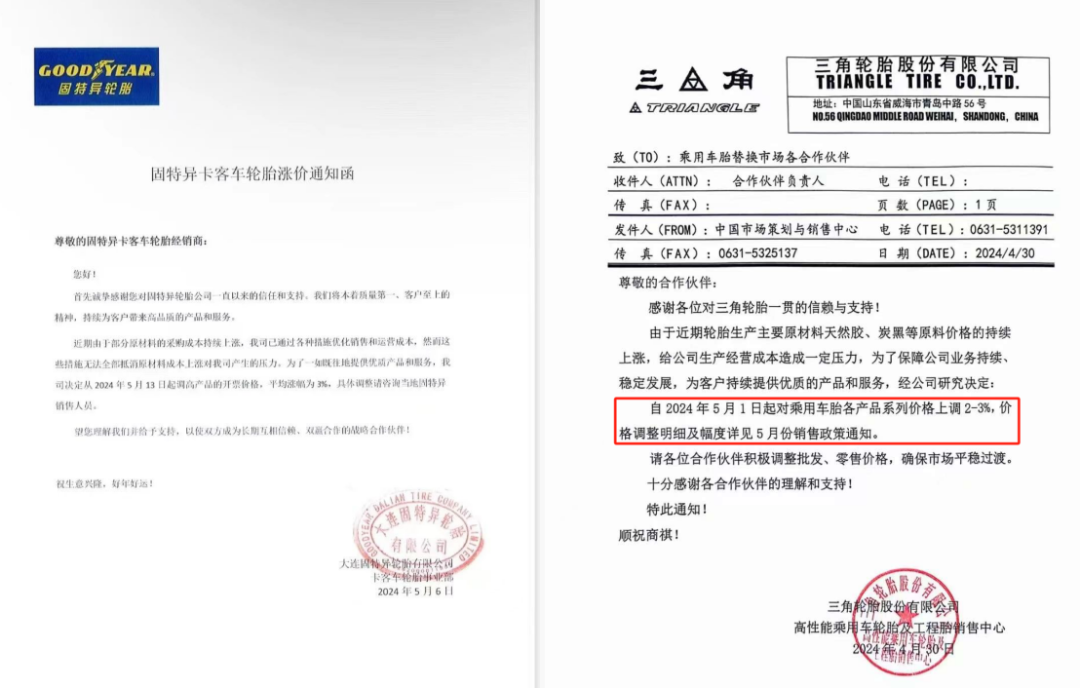 2月以來,已有76家輪胎公司發布了92份漲價通知。僅在5月就有多家知名企業宣布產品漲價,漲幅約3%左右。大連固特異輪胎漲幅3%,三角輪胎對乘用車胎各產品系列價格上調2-3%,上海優科豪馬輪胎對乘用車輪胎產品調漲3%~6%,建泰橡膠(深圳)對建大集團大陸市場PCR輪胎的替換市場價格上調3%-5%,瑪吉斯輪胎對瑪吉斯乘用車胎調漲2%。