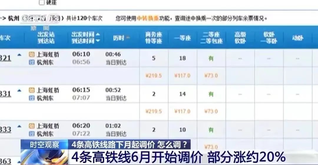 鐵路12306官網發布四則調價公告,自6月15日調整京廣高鐵武廣段、滬昆高鐵滬杭段、滬昆高鐵杭長段、杭深鐵路杭甬段等4條熱門高鐵線路票價,漲幅在19%-20%左右。
