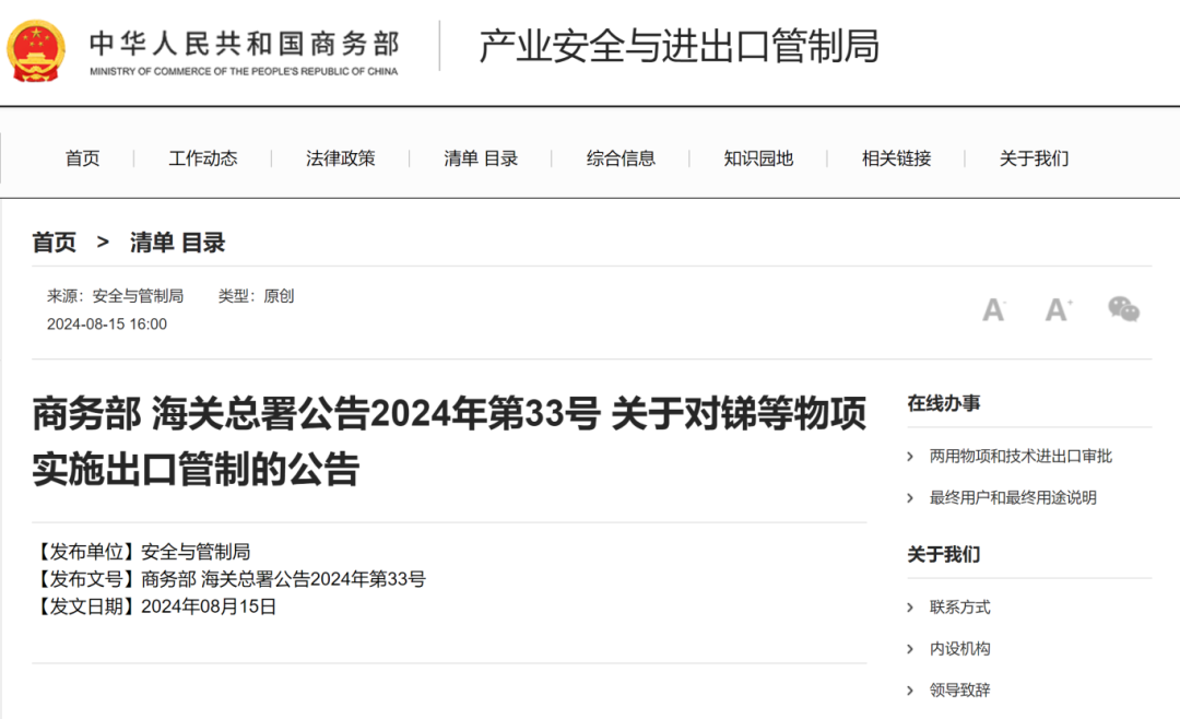 15日下午,商務(wù)部、海關(guān)總署聯(lián)合發(fā)布了《關(guān)于對銻等物項(xiàng)實(shí)施出口管制的公告》(下稱“公告”)。公告顯示,根據(jù)相關(guān)規(guī)定,為維護(hù)國家安全和利益、履行防擴(kuò)散等國際義務(wù),經(jīng)國務(wù)院批準(zhǔn),決定對銻等物項(xiàng)實(shí)施出口管制。公告自2024年9月15日起正式實(shí)施。