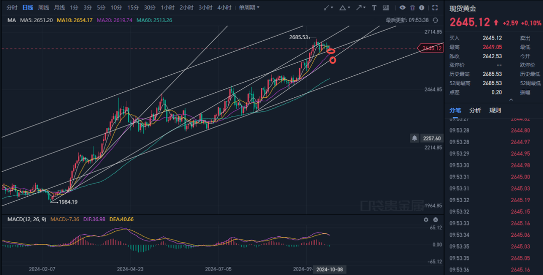 行情回顧:近期就業(yè)數(shù)據(jù)靚麗,投資者降低了對(duì)美聯(lián)儲(chǔ)11月大幅降息的預(yù)期,美元保持強(qiáng)勢,美債收益率時(shí)隔兩個(gè)月首次升破4%,令金價(jià)承壓。現(xiàn)貨黃金延續(xù)回調(diào),錄得日線四連陰,盤中最低觸及2637.71美元/盎司,最終收跌0.40%,報(bào)2642.63美元/盎司,市場對(duì)美聯(lián)儲(chǔ)降息幅度的預(yù)期減少。