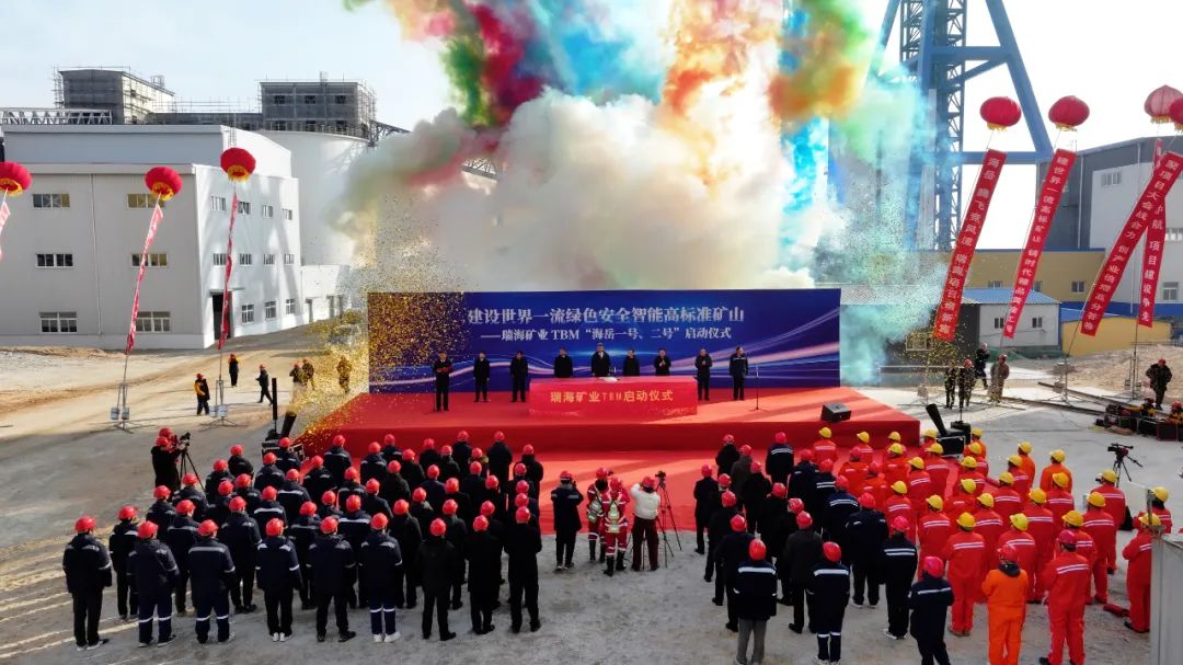 2024年12月30日上午9時(shí)36分,瑞海礦業(yè)有限公司副井井塔前嘉賓齊聚、彩球飄飄、旌旗獵獵,十二條巨幅標(biāo)語(yǔ)迎風(fēng)招展,兩臺(tái)TBM(全斷面硬巖隧道掘進(jìn)機(jī))啟動(dòng)儀式揭幕,瑞海礦業(yè)總經(jīng)理于明海、浙江省隧道工程集團(tuán)公司副董事長(zhǎng)黃德祥、山東招金礦業(yè)股份有限公司董事長(zhǎng)姜桂鵬先后作了發(fā)言和致辭。上午10時(shí),隨著萊州市政府副市長(zhǎng)邱召明宣布“萊州市瑞海礦業(yè)有限公司‘海岳一號(hào)、海岳二號(hào)’TBM發(fā)車(chē)”,萊州市政府副市長(zhǎng)邱召明,招遠(yuǎn)市政府副市長(zhǎng)荊興業(yè),山東招金集團(tuán)有限公司副董事長(zhǎng)、總經(jīng)理王樂(lè)譯,招金礦業(yè)董事長(zhǎng)姜桂鵬等嘉賓共同按下啟動(dòng)球。