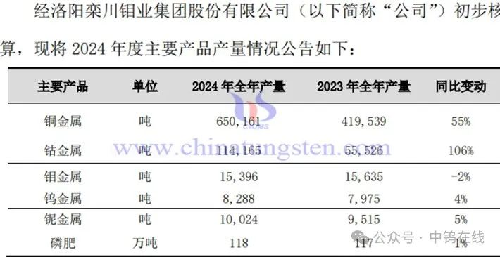 漲4%!洛陽鉬業2024年鎢金屬產量近8300噸
