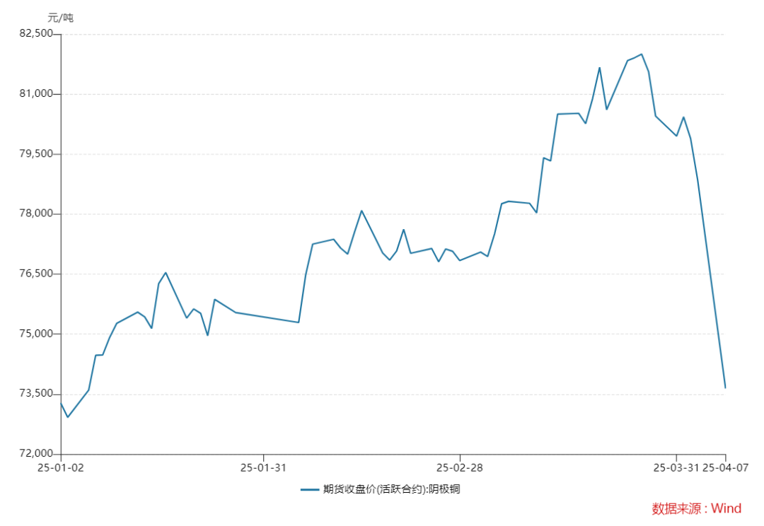 就在兩周前還在市場中炙手可熱的“明星”——銅,在清明節遭遇“滑鐵盧”。國外方面,近期倫敦金屬交易所(LME)銅價沖上1萬美元/噸高位后,掉頭向下,4月4日盤中跌至8644美元/噸;紐約商品交易所(COMEX)銅期貨價格也是連續兩個交易日大跌,4月4日收于4.38美元/磅。國內方面,截至4月7日收盤,滬銅主力合約最低已觸及73640元/噸,較前一交易日下跌5550元,跌幅達7.01%。
