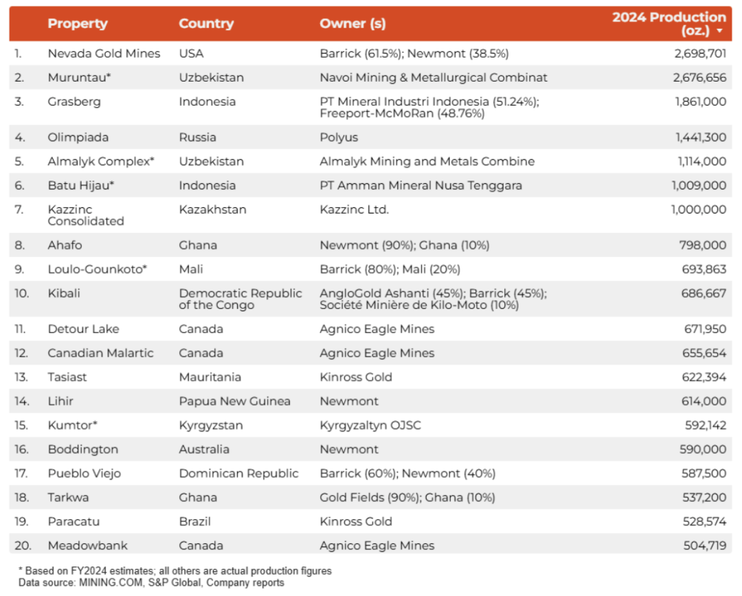 根據(jù)實際或估計的產(chǎn)量,外媒mining.com對2024年前20名黃金生產(chǎn)業(yè)務(wù)進行排名。位于美國內(nèi)華達州的內(nèi)華達金礦(Nevada Gold Mines,簡稱NGM)2024年生產(chǎn)269.87萬盎司黃金(約84噸),是全球最大的金礦綜合體。該綜合體自加拿大黃金巨頭巴里克黃金放棄對美國競爭對手紐蒙特的敵意收購后,雙方創(chuàng)建的合資公司,將兩家公司在內(nèi)華達州的資產(chǎn)合并在一起。目前,該金礦綜合體包括10個地下礦山和12個露天礦組成,巴里克黃金(Barrick Gold)持股61.5%,紐蒙特(Newmont)持股38.5%。