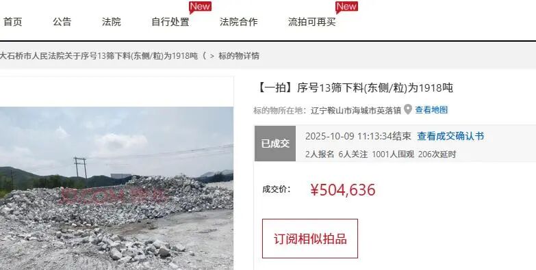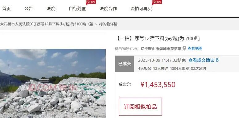 值得注意的是,也是在10月9日,同樣是存放在遼南鎂礦耐火材料廠青山懷鎂礦廠區(qū)內(nèi)的另外一批礦石也是被拍賣,礦石重量為1918噸,不過(guò)從圖片來(lái)看,礦石質(zhì)量要差一些。
